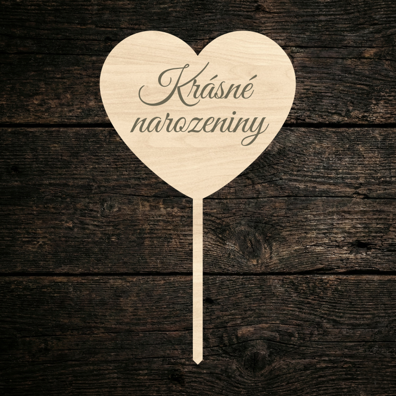 Zápich do dortu ve tvaru srdce s kaligrafickým nápisem „Krásné narozeniny“. Na fotografii má světlý dřevěný vzhled, díky kterému působí přírodně a nadčasově. Stačí jej zapíchnout do dortu a během pár vteřin získáte výraznou dekoraci, která vynikne i na fotkách.