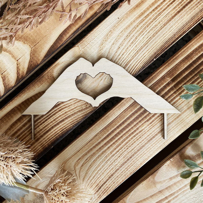 Dřevěný zápich do dortu ve tvaru tvou rukou, tvořící srdce.